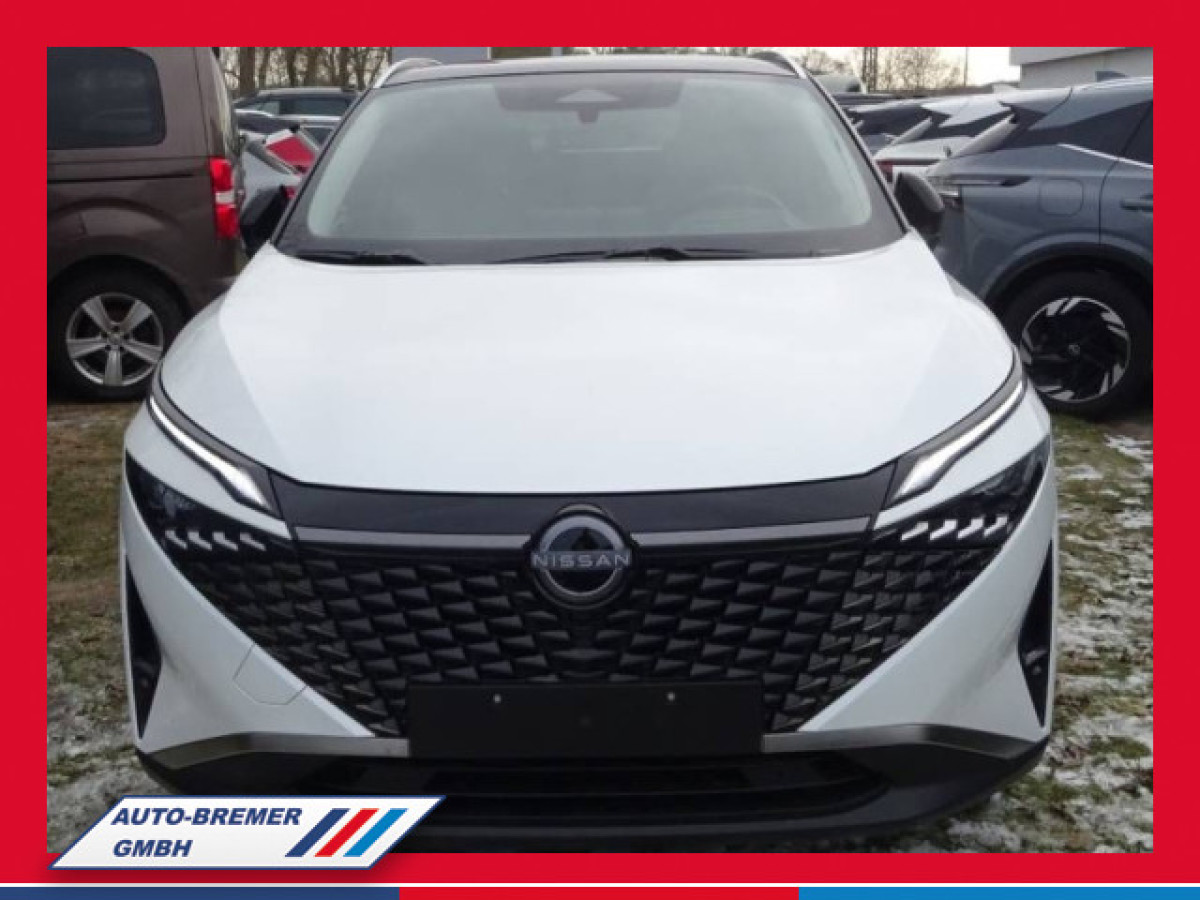 Sonstiges: Außenfarbe WHITE/BLACK; Farbcode außen: (XKJ); sensorgesteuert); Fahrassistenz-System: Autonomer Lenk-Assistent für selbstständiges Spurhalten; RCTA); 2-Farben-Lackierung; Fahrmodusschalter; Mild-Hybrid 116 kW (Motor 1,3 Ltr. - 116 kW DIG-T MHEV); Lenkrad (Leder) mit Multifunktion; Ambiente-Beleuchtung; Antriebsart: Frontantrieb; Blinkleuchten LED in Außenspiegel integriert; Dachantenne im Haifischflossen-Design; Dachhimmel hellgrau; Handschuhfach beleuchtet; Innenraumfilter: Pollenfilter; Kniepolster Mittelkonsole seitlich; Kofferraumbeleuchtung; Lastenverankerung / Verzurrösen; Lenksäule (Lenkrad) höhen-/längsverstellbar; Leseleuchten vorn und hinten; Nebelschlussleuchte LED; Notbrems-Warnblinkautomatik; Schalt-/Wählhebelgriff Leder; Scheibenwischer mit Intervallschaltung; Service-System: Amazon Alexa; Service-System: Nissan Connect Services; Sitz vorn links höhenverstellbar; Sonnenblenden mit Spiegel (beleuchtet); Steckdose (12V-Anschluß) in Mittelkonsole